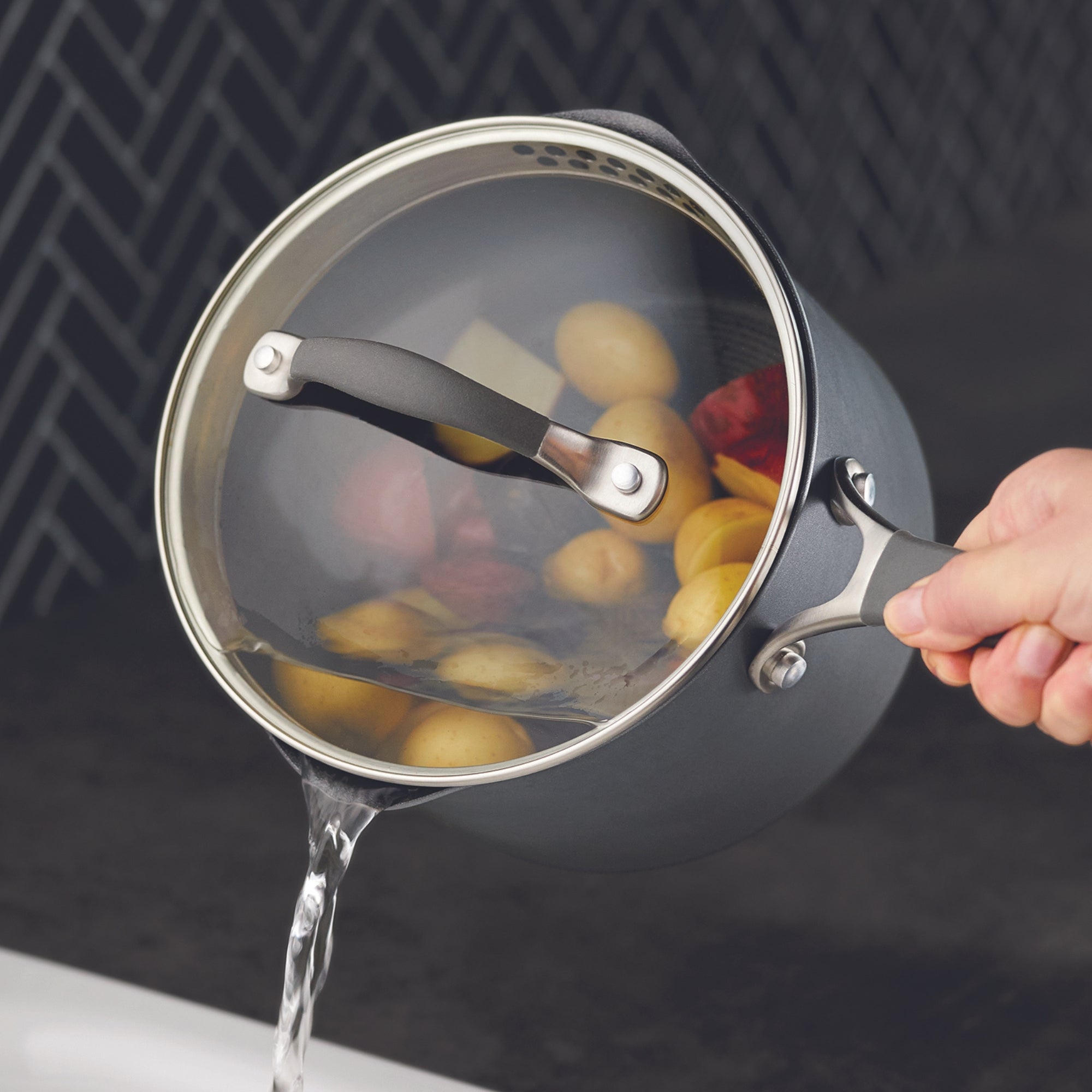 - Convenient lids with dual-sized straining holes reduce cleanup - for quick straining of vegetables, pasta & more. Tough clear shatter-resistant glass lids seal in heat and moisture while allowing you to keep on eye on your cooking.
